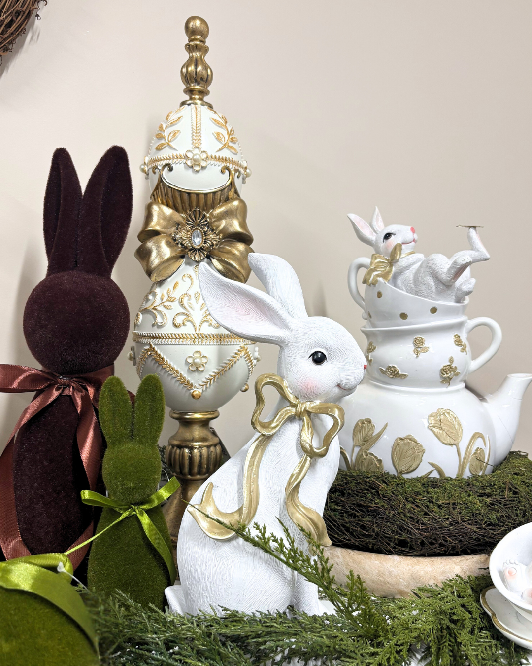 Elegant gold and white with rich chocolate and moss tones for a sophisticated Easter display.