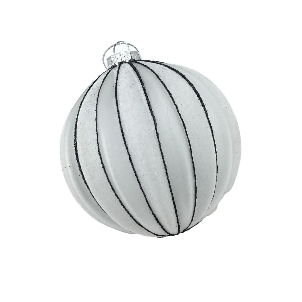 10cm diameter white bauble with fine black bead trim.